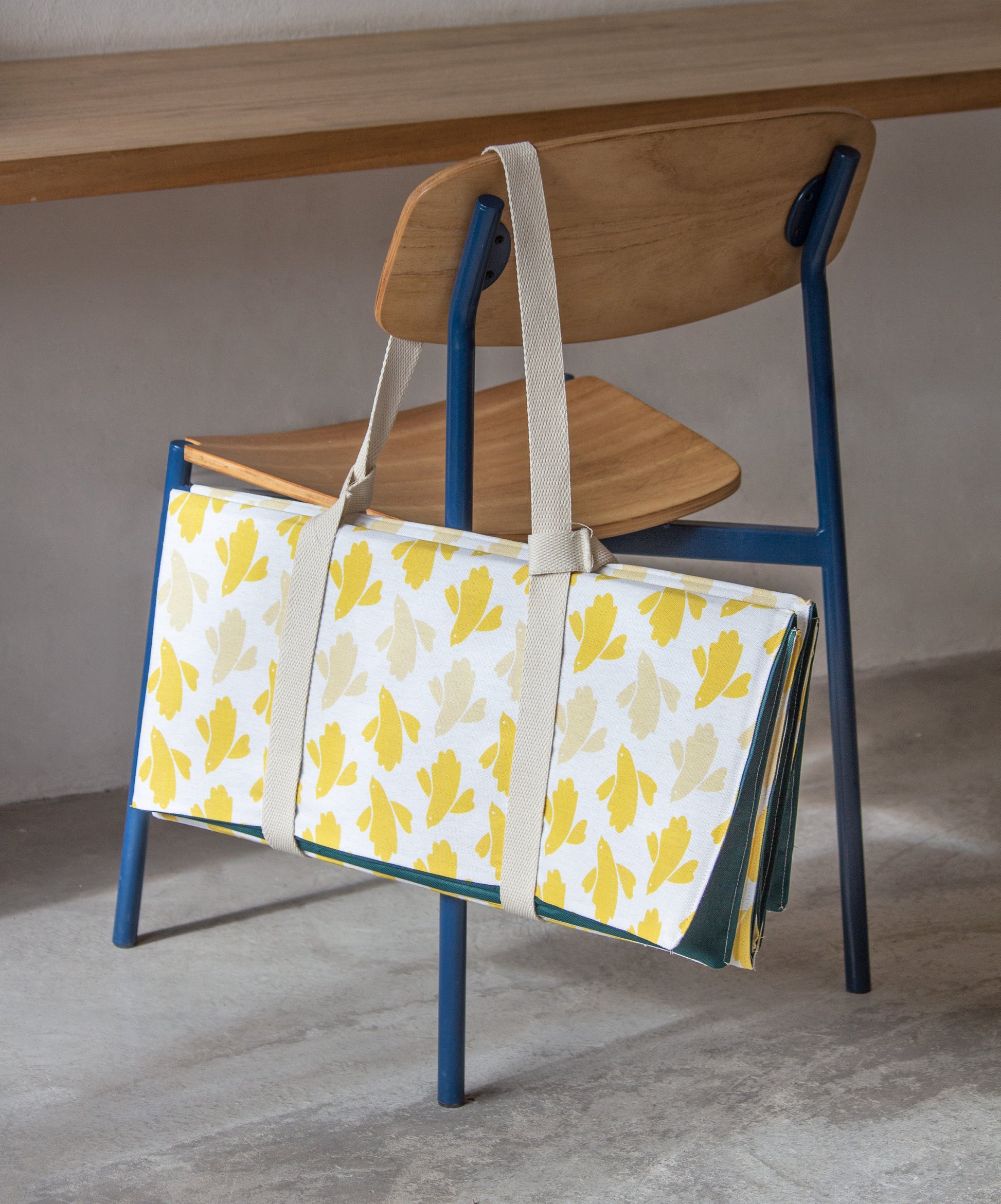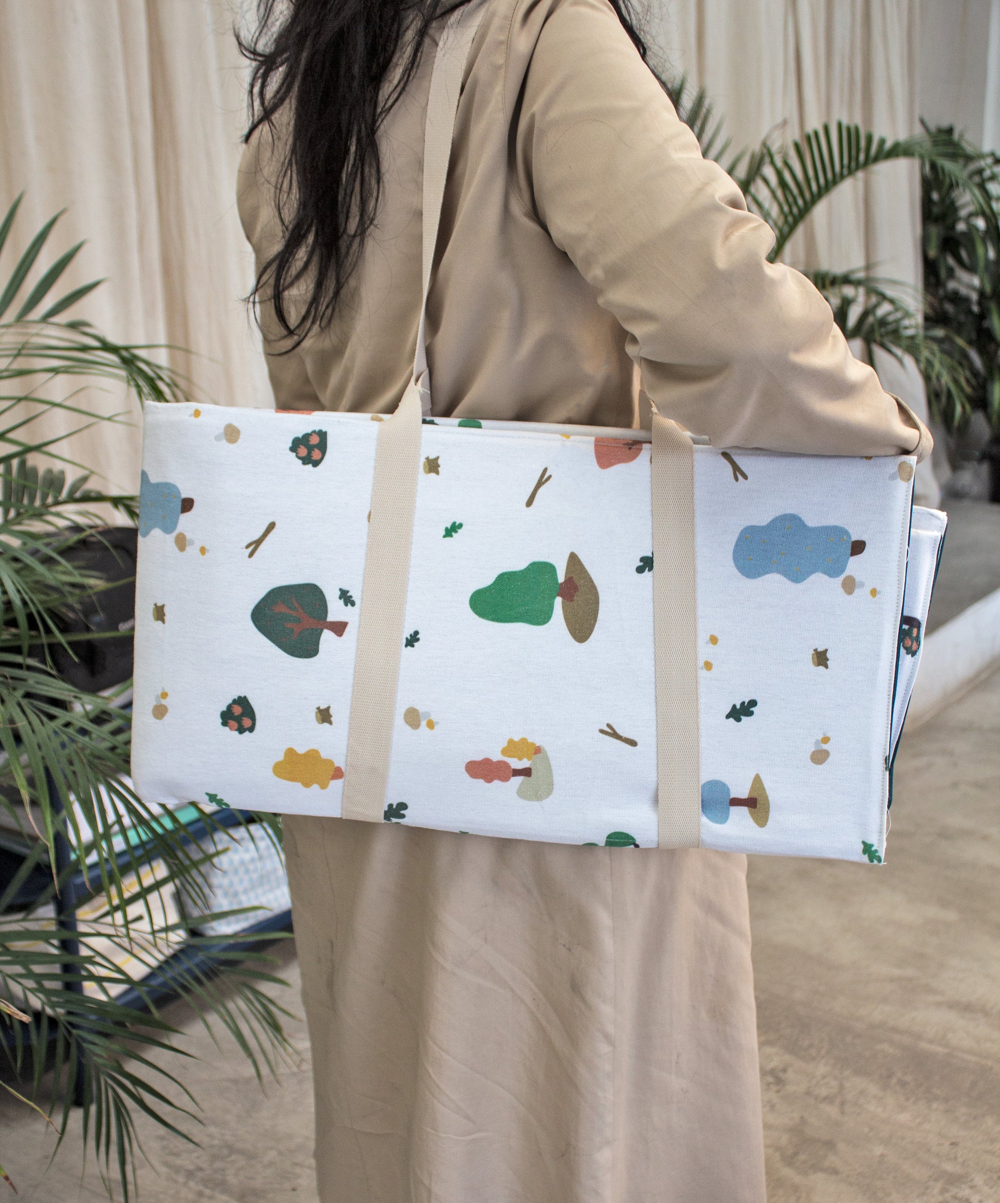 Más adelante se transforma en una lona acolchonadita para llevar a los paseo al aire libre, jugar y descansar sobre el pasto.